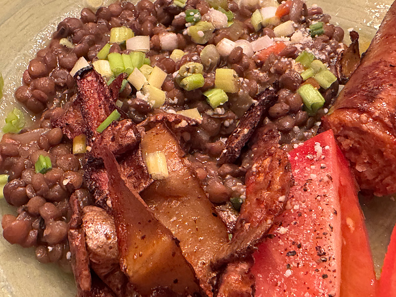 • Sausage (chorizo?), lentils on the side & fresh grape tomato salad. Try with sautéed potato skins.
