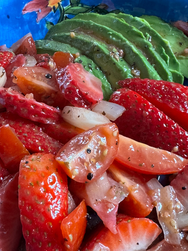 - Add the sliced strawberries and grape tomatoes to the saturated onions, toss well together. Let sit for a couple of minutes to soak in the vinaigrette.